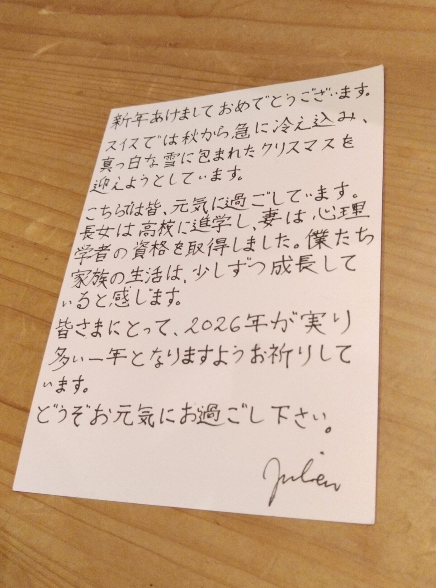 家に帰ると、毎年恒例の年賀状とスイスチョコが、友人のジュリアンから届いていた。私が送ったのは、入浴剤と温泉に関する書籍のセット。今頃スイスのロザンヌで、日本と温泉が好きなジュリアンに喜ばれているかも知れない。もう何年も続く、伝統的で、国際的で、且つ私的な儀式。いつかスイスと日本で、彼と温泉に浸かるのが夢だ。